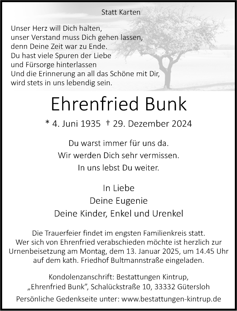 Hier finden Sie alle Traueranzeigen aus der Zeitung, die bisher für Ehrenfried Bunk erschienen sind. Weitere Traueranzeigen, die in der Zeitung erscheinen, werden hier ebenfalls aufgelistet