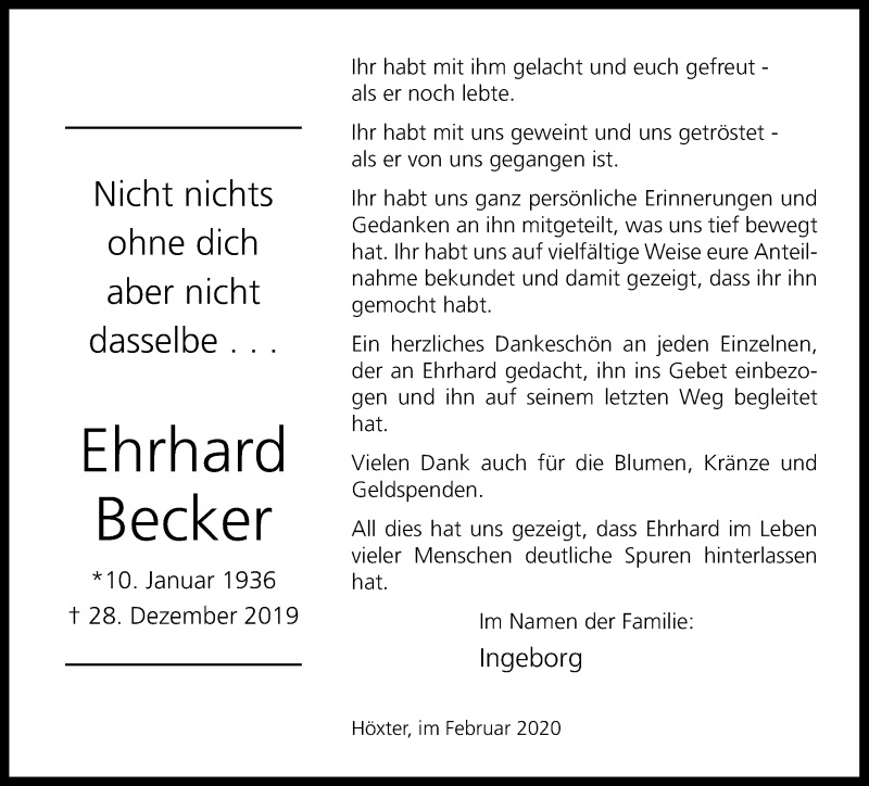 Hier finden Sie alle Traueranzeigen aus der Zeitung, die bisher für Ehrhard Becker erschienen sind. Weitere Traueranzeigen, die in der Zeitung erscheinen, werden hier ebenfalls aufgelistet