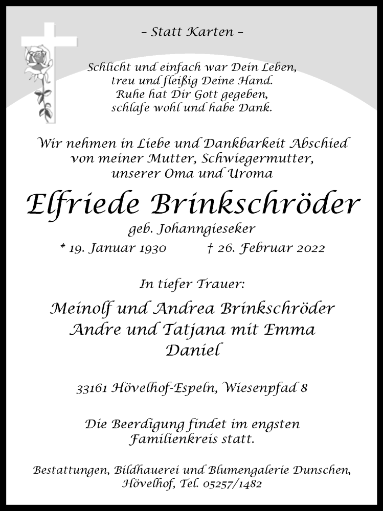 Hier finden Sie alle Traueranzeigen aus der Zeitung, die bisher für Elfriede Brinkschröder erschienen sind. Weitere Traueranzeigen, die in der Zeitung erscheinen, werden hier ebenfalls aufgelistet