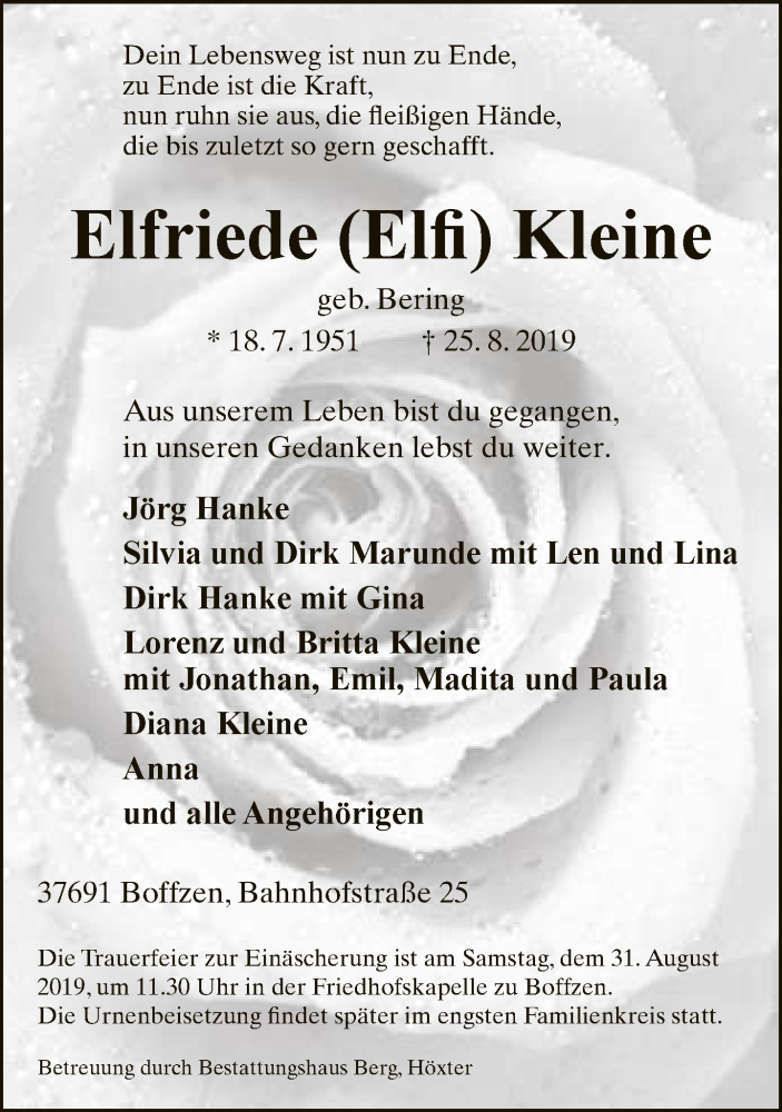Hier finden Sie alle Traueranzeigen aus der Zeitung, die bisher für Elfriede Elfi Kleine erschienen sind. Weitere Traueranzeigen, die in der Zeitung erscheinen, werden hier ebenfalls aufgelistet