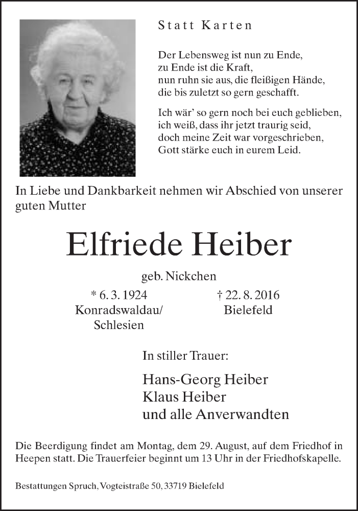 Hier finden Sie alle Traueranzeigen aus der Zeitung, die bisher für Elfriede Heiber erschienen sind. Weitere Traueranzeigen, die in der Zeitung erscheinen, werden hier ebenfalls aufgelistet
