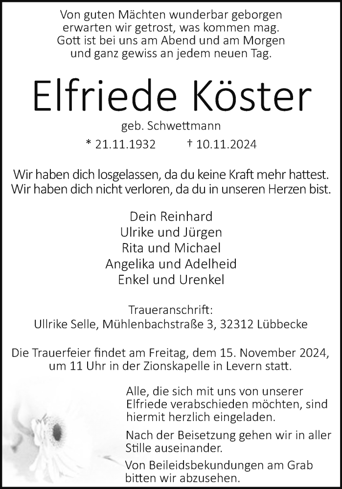 Hier finden Sie alle Traueranzeigen aus der Zeitung, die bisher für Elfriede Köster erschienen sind. Weitere Traueranzeigen, die in der Zeitung erscheinen, werden hier ebenfalls aufgelistet