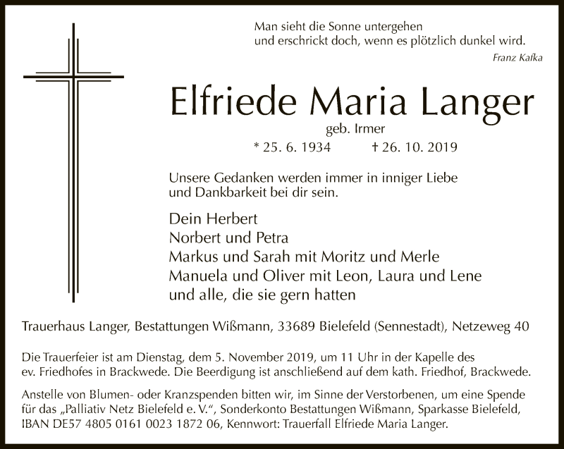 Hier finden Sie alle Traueranzeigen aus der Zeitung, die bisher für Elfriede Maria Langer erschienen sind. Weitere Traueranzeigen, die in der Zeitung erscheinen, werden hier ebenfalls aufgelistet