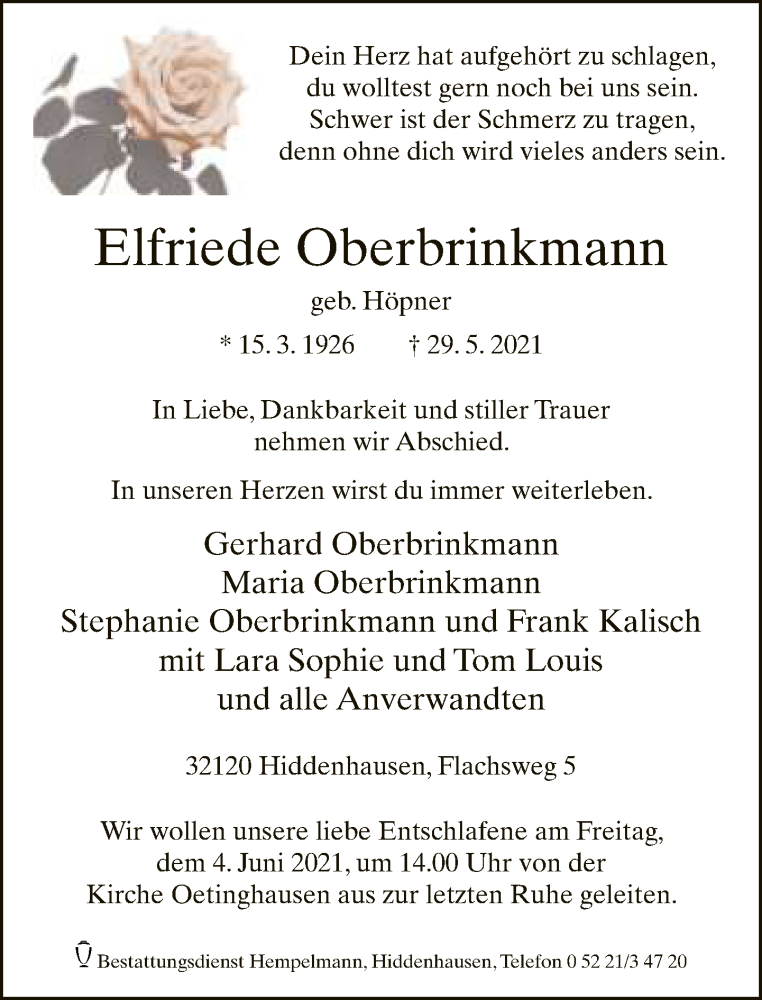 Hier finden Sie alle Traueranzeigen aus der Zeitung, die bisher für Elfriede Oberbrinkmann erschienen sind. Weitere Traueranzeigen, die in der Zeitung erscheinen, werden hier ebenfalls aufgelistet