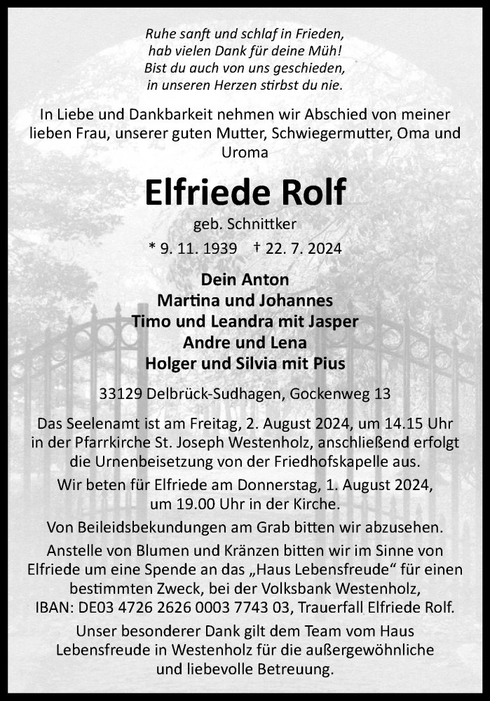 Hier finden Sie alle Traueranzeigen aus der Zeitung, die bisher für Elfriede Rolf erschienen sind. Weitere Traueranzeigen, die in der Zeitung erscheinen, werden hier ebenfalls aufgelistet