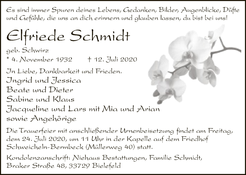 Hier finden Sie alle Traueranzeigen aus der Zeitung, die bisher für Elfriede Schmidt erschienen sind. Weitere Traueranzeigen, die in der Zeitung erscheinen, werden hier ebenfalls aufgelistet