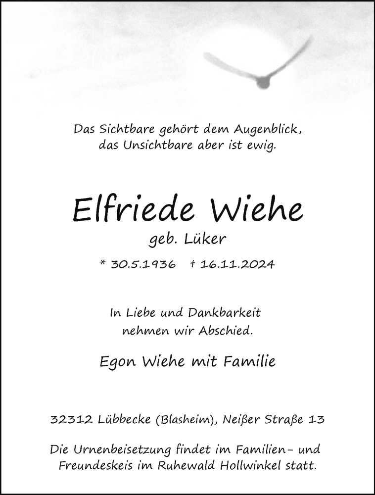 Hier finden Sie alle Traueranzeigen aus der Zeitung, die bisher für Elfriede Wiehe erschienen sind. Weitere Traueranzeigen, die in der Zeitung erscheinen, werden hier ebenfalls aufgelistet