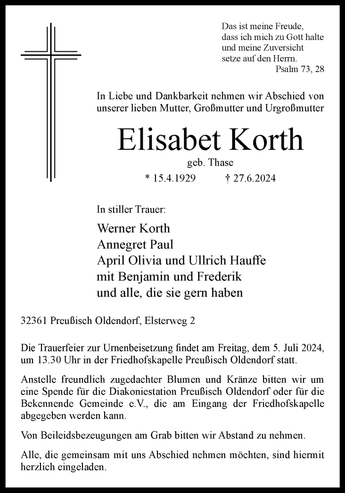 Hier finden Sie alle Traueranzeigen aus der Zeitung, die bisher für Elisabet Korth erschienen sind. Weitere Traueranzeigen, die in der Zeitung erscheinen, werden hier ebenfalls aufgelistet
