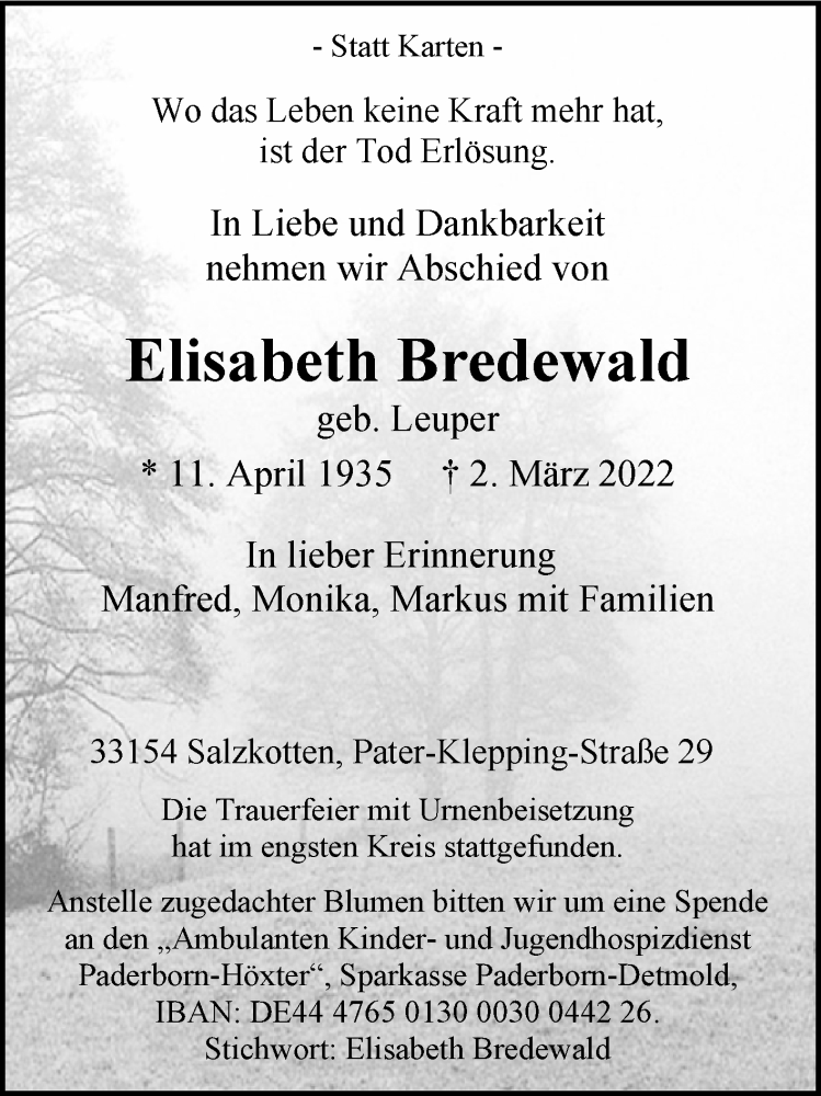 Hier finden Sie alle Traueranzeigen aus der Zeitung, die bisher für Elisabeth Bredewald erschienen sind. Weitere Traueranzeigen, die in der Zeitung erscheinen, werden hier ebenfalls aufgelistet