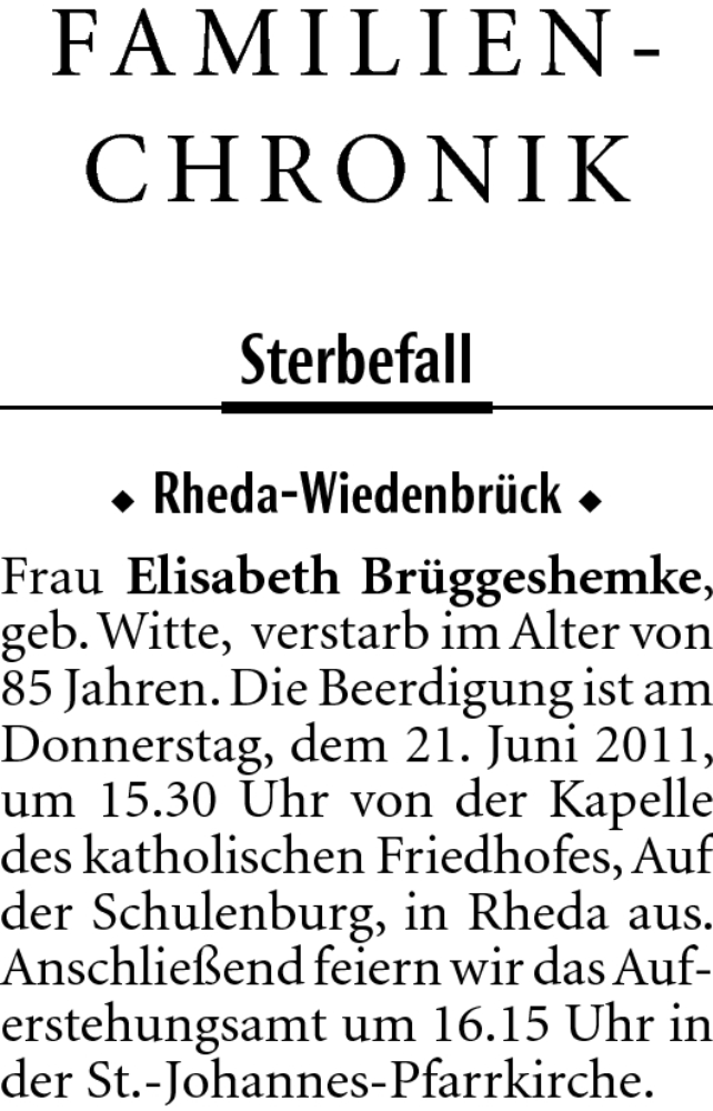 Hier finden Sie alle Traueranzeigen aus der Zeitung, die bisher für Elisabeth Brüggeshemke erschienen sind. Weitere Traueranzeigen, die in der Zeitung erscheinen, werden hier ebenfalls aufgelistet