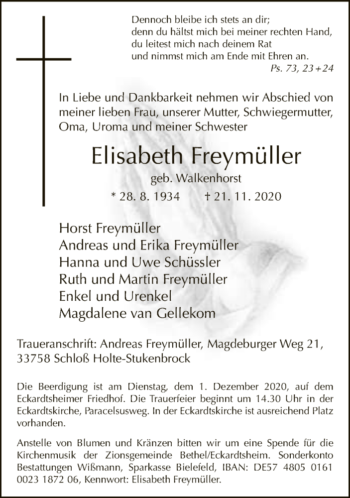 Hier finden Sie alle Traueranzeigen aus der Zeitung, die bisher für Elisabeth Freymüller erschienen sind. Weitere Traueranzeigen, die in der Zeitung erscheinen, werden hier ebenfalls aufgelistet