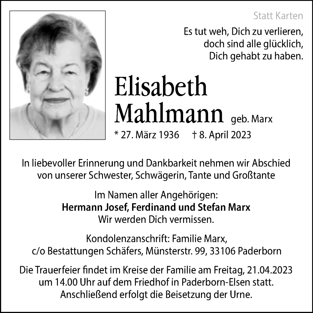 Hier finden Sie alle Traueranzeigen aus der Zeitung, die bisher für Elisabeth Mahlmann erschienen sind. Weitere Traueranzeigen, die in der Zeitung erscheinen, werden hier ebenfalls aufgelistet
