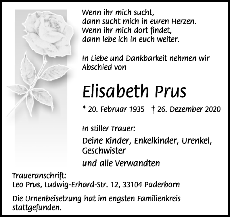 Hier finden Sie alle Traueranzeigen aus der Zeitung, die bisher für Elisabeth Prus erschienen sind. Weitere Traueranzeigen, die in der Zeitung erscheinen, werden hier ebenfalls aufgelistet