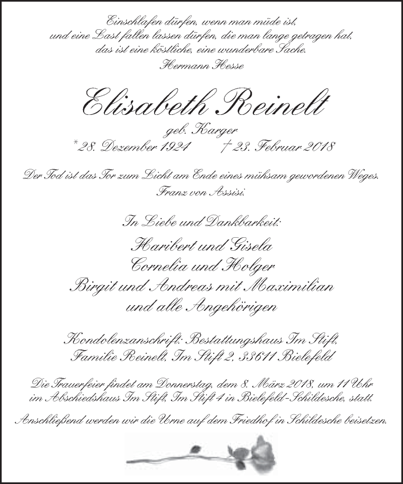 Hier finden Sie alle Traueranzeigen aus der Zeitung, die bisher für Elisabeth Reinelt erschienen sind. Weitere Traueranzeigen, die in der Zeitung erscheinen, werden hier ebenfalls aufgelistet