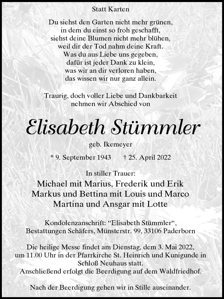 Hier finden Sie alle Traueranzeigen aus der Zeitung, die bisher für Elisabeth Stümmler erschienen sind. Weitere Traueranzeigen, die in der Zeitung erscheinen, werden hier ebenfalls aufgelistet