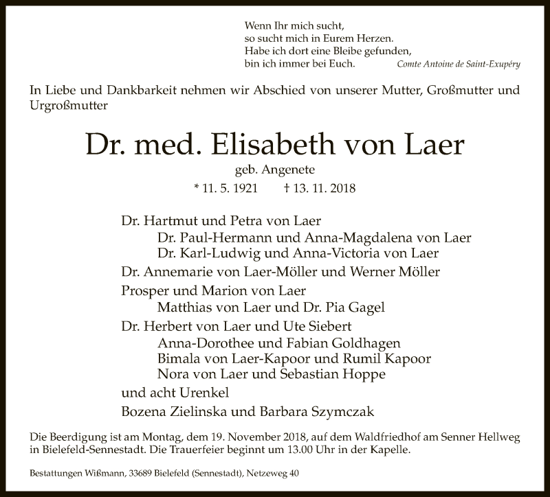 Hier finden Sie alle Traueranzeigen aus der Zeitung, die bisher für Elisabeth von Laer erschienen sind. Weitere Traueranzeigen, die in der Zeitung erscheinen, werden hier ebenfalls aufgelistet