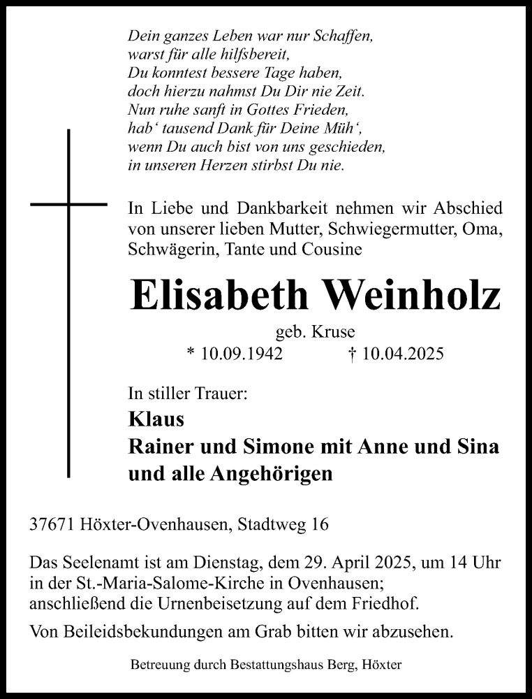 Hier finden Sie alle Traueranzeigen aus der Zeitung, die bisher für Elisabeth Weinholz erschienen sind. Weitere Traueranzeigen, die in der Zeitung erscheinen, werden hier ebenfalls aufgelistet