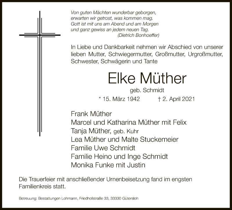 Hier finden Sie alle Traueranzeigen aus der Zeitung, die bisher für Elke Müther erschienen sind. Weitere Traueranzeigen, die in der Zeitung erscheinen, werden hier ebenfalls aufgelistet