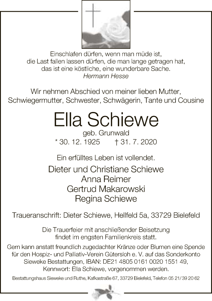 Hier finden Sie alle Traueranzeigen aus der Zeitung, die bisher für Ella Schiewe erschienen sind. Weitere Traueranzeigen, die in der Zeitung erscheinen, werden hier ebenfalls aufgelistet