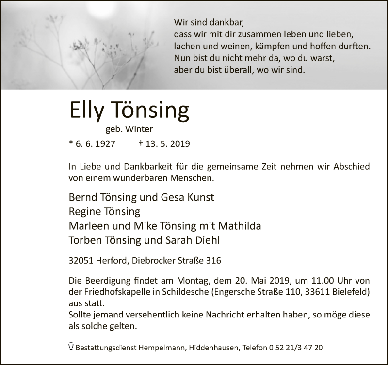 Hier finden Sie alle Traueranzeigen aus der Zeitung, die bisher für Elly Tönsing erschienen sind. Weitere Traueranzeigen, die in der Zeitung erscheinen, werden hier ebenfalls aufgelistet