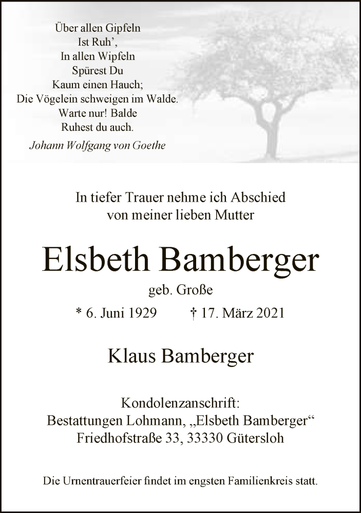 Hier finden Sie alle Traueranzeigen aus der Zeitung, die bisher für Elsbeth Bamberger erschienen sind. Weitere Traueranzeigen, die in der Zeitung erscheinen, werden hier ebenfalls aufgelistet