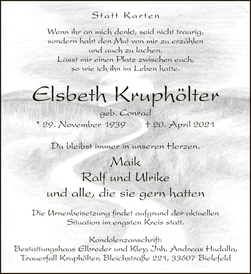 Hier finden Sie alle Traueranzeigen aus der Zeitung, die bisher für Elsbeth Kruphölter erschienen sind. Weitere Traueranzeigen, die in der Zeitung erscheinen, werden hier ebenfalls aufgelistet