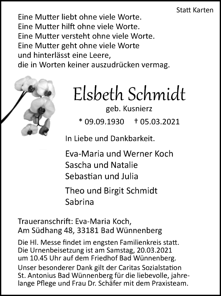 Hier finden Sie alle Traueranzeigen aus der Zeitung, die bisher für Elsbeth Schmidt erschienen sind. Weitere Traueranzeigen, die in der Zeitung erscheinen, werden hier ebenfalls aufgelistet