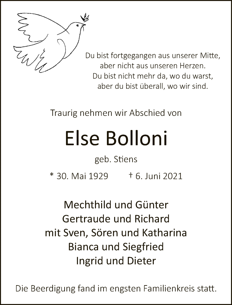 Hier finden Sie alle Traueranzeigen aus der Zeitung, die bisher für Else Bolloni erschienen sind. Weitere Traueranzeigen, die in der Zeitung erscheinen, werden hier ebenfalls aufgelistet