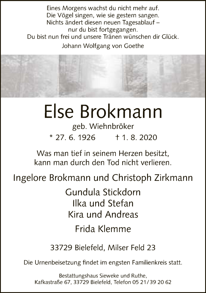 Hier finden Sie alle Traueranzeigen aus der Zeitung, die bisher für Else Brokmann erschienen sind. Weitere Traueranzeigen, die in der Zeitung erscheinen, werden hier ebenfalls aufgelistet