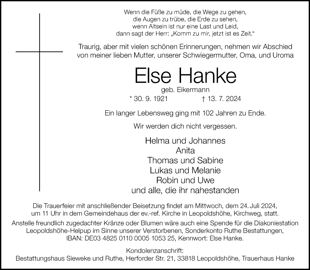 Hier finden Sie alle Traueranzeigen aus der Zeitung, die bisher für Else Hanke erschienen sind. Weitere Traueranzeigen, die in der Zeitung erscheinen, werden hier ebenfalls aufgelistet
