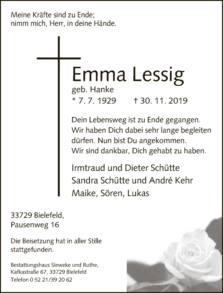 Hier finden Sie alle Traueranzeigen aus der Zeitung, die bisher für Emma Lessig erschienen sind. Weitere Traueranzeigen, die in der Zeitung erscheinen, werden hier ebenfalls aufgelistet
