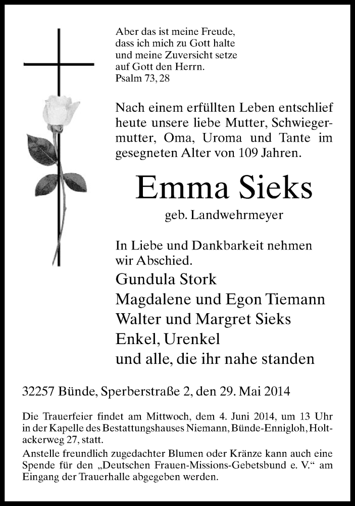 Hier finden Sie alle Traueranzeigen aus der Zeitung, die bisher für Emma Sieks erschienen sind. Weitere Traueranzeigen, die in der Zeitung erscheinen, werden hier ebenfalls aufgelistet
