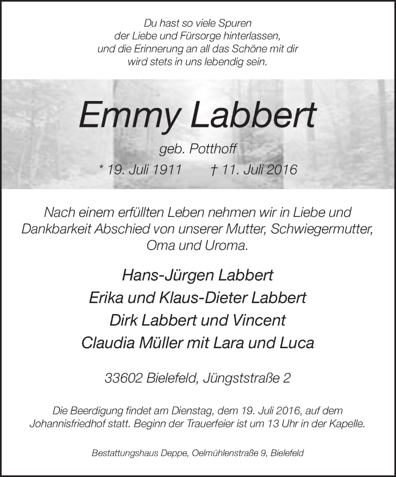 Hier finden Sie alle Traueranzeigen aus der Zeitung, die bisher für Emmy Labbert erschienen sind. Weitere Traueranzeigen, die in der Zeitung erscheinen, werden hier ebenfalls aufgelistet