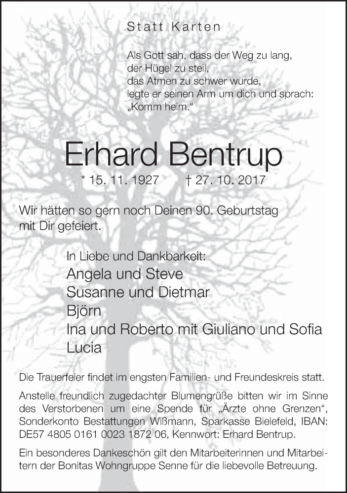 Hier finden Sie alle Traueranzeigen aus der Zeitung, die bisher für Erhard Bentrup erschienen sind. Weitere Traueranzeigen, die in der Zeitung erscheinen, werden hier ebenfalls aufgelistet