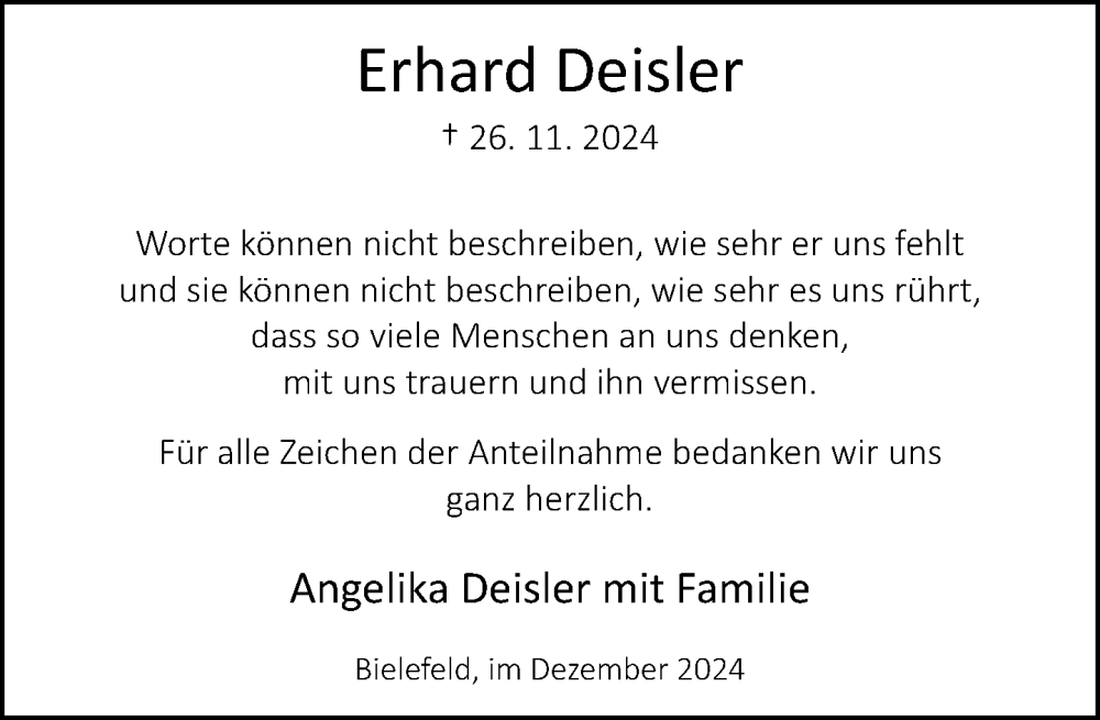 Hier finden Sie alle Traueranzeigen aus der Zeitung, die bisher für Erhard Deisler erschienen sind. Weitere Traueranzeigen, die in der Zeitung erscheinen, werden hier ebenfalls aufgelistet