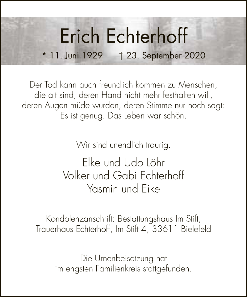 Hier finden Sie alle Traueranzeigen aus der Zeitung, die bisher für Erich Echterhoff erschienen sind. Weitere Traueranzeigen, die in der Zeitung erscheinen, werden hier ebenfalls aufgelistet