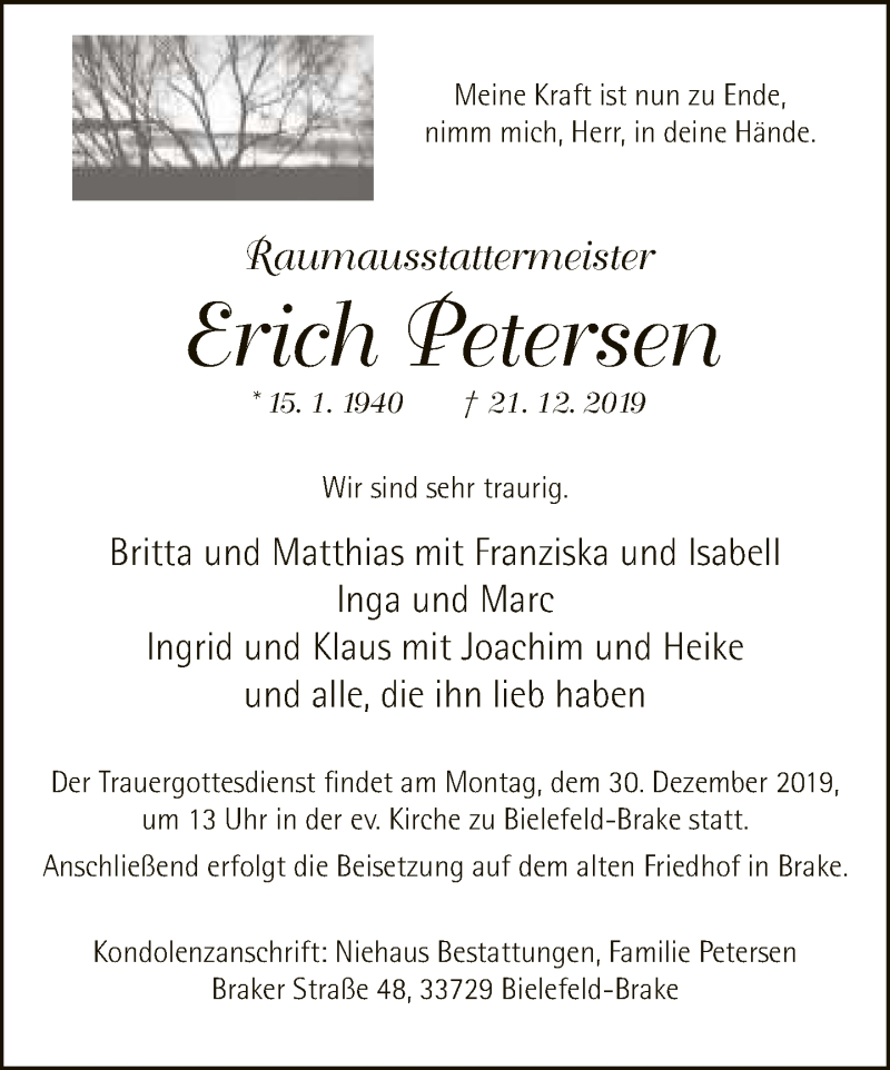 Hier finden Sie alle Traueranzeigen aus der Zeitung, die bisher für Erich Petersen erschienen sind. Weitere Traueranzeigen, die in der Zeitung erscheinen, werden hier ebenfalls aufgelistet