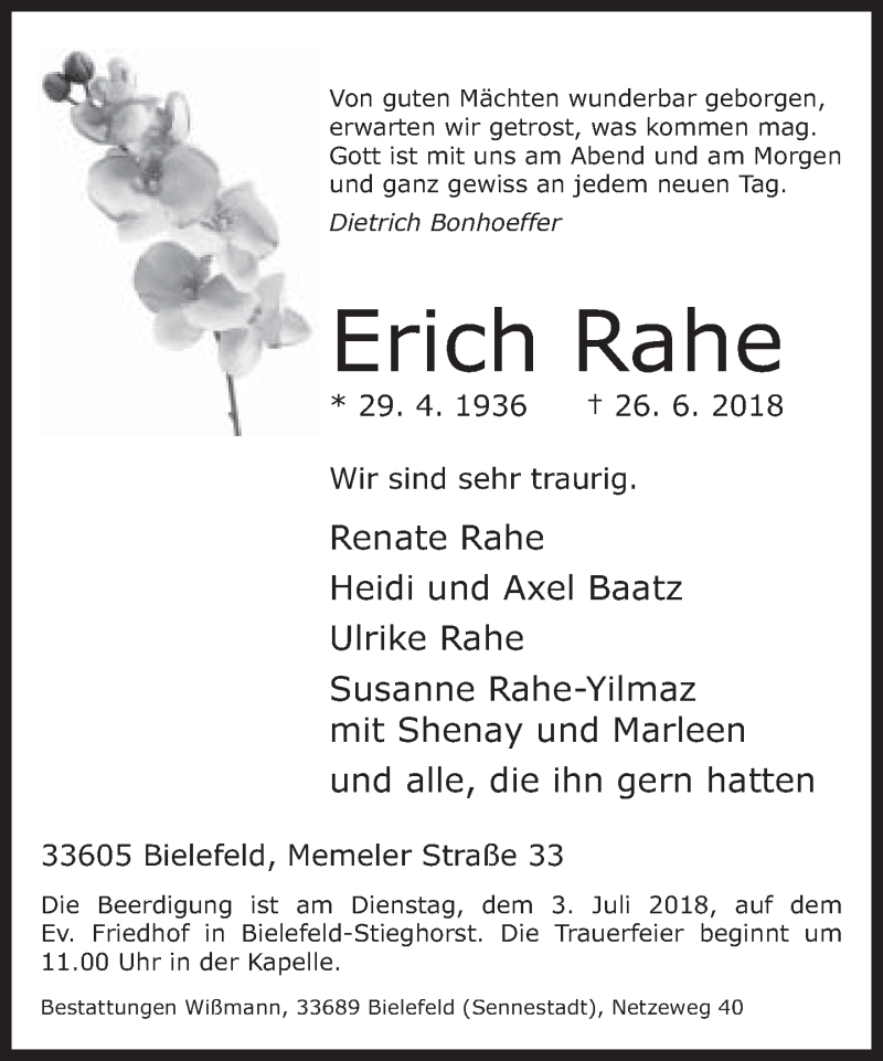Hier finden Sie alle Traueranzeigen aus der Zeitung, die bisher für Erich Rahe erschienen sind. Weitere Traueranzeigen, die in der Zeitung erscheinen, werden hier ebenfalls aufgelistet