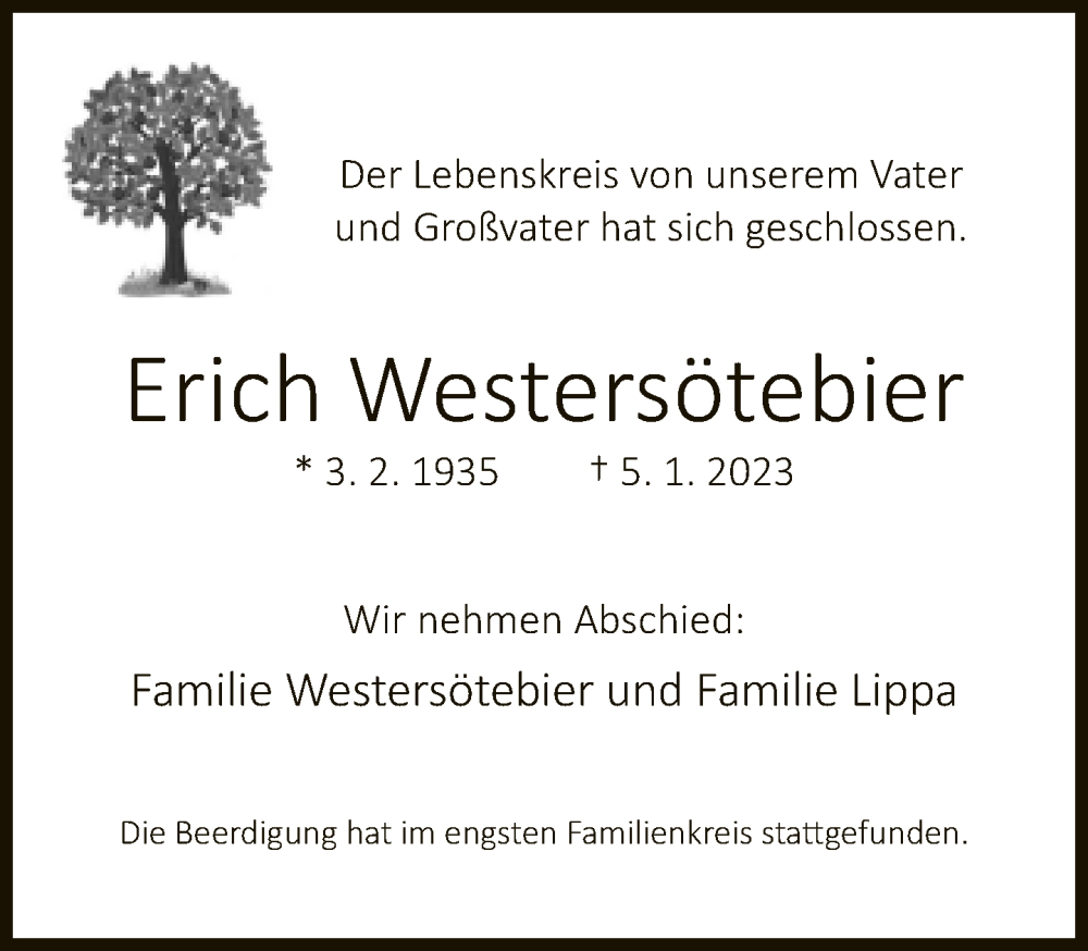 Hier finden Sie alle Traueranzeigen aus der Zeitung, die bisher für Erich Westersötebier erschienen sind. Weitere Traueranzeigen, die in der Zeitung erscheinen, werden hier ebenfalls aufgelistet