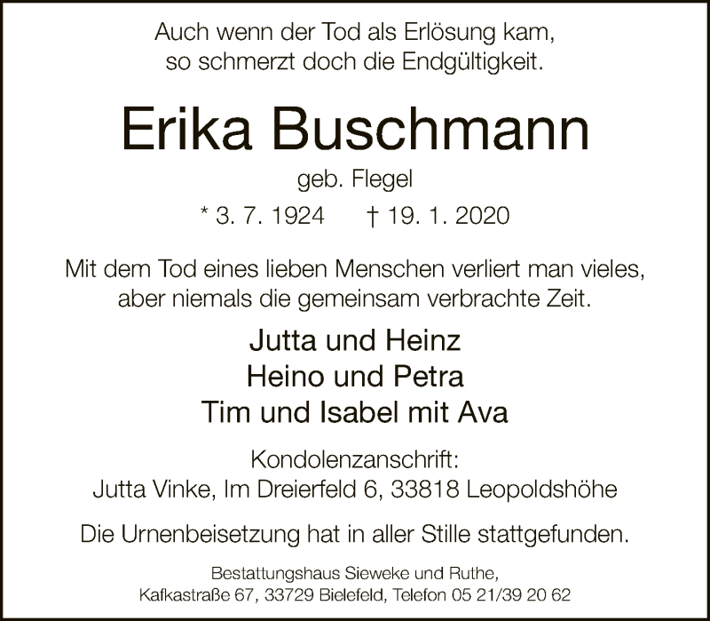 Hier finden Sie alle Traueranzeigen aus der Zeitung, die bisher für Erika Buschmann erschienen sind. Weitere Traueranzeigen, die in der Zeitung erscheinen, werden hier ebenfalls aufgelistet
