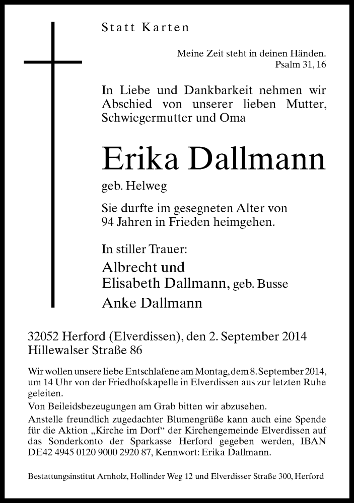 Hier finden Sie alle Traueranzeigen aus der Zeitung, die bisher für Erika Dallmann erschienen sind. Weitere Traueranzeigen, die in der Zeitung erscheinen, werden hier ebenfalls aufgelistet