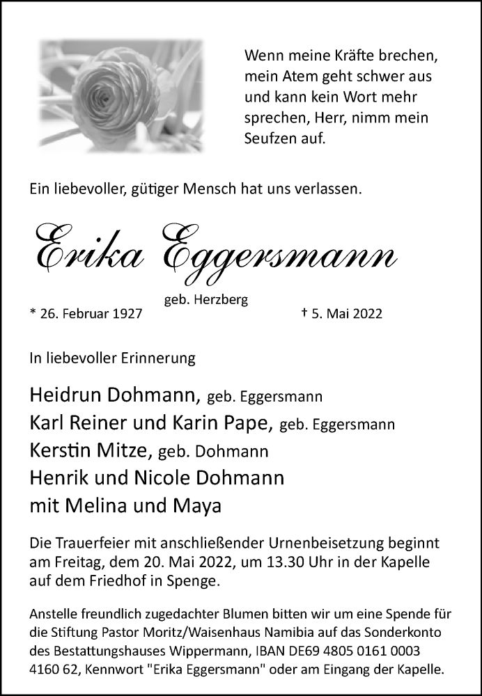 Hier finden Sie alle Traueranzeigen aus der Zeitung, die bisher für Erika Eggersmann erschienen sind. Weitere Traueranzeigen, die in der Zeitung erscheinen, werden hier ebenfalls aufgelistet