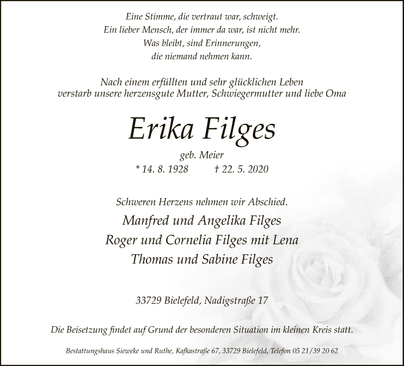 Hier finden Sie alle Traueranzeigen aus der Zeitung, die bisher für Erika Filges erschienen sind. Weitere Traueranzeigen, die in der Zeitung erscheinen, werden hier ebenfalls aufgelistet