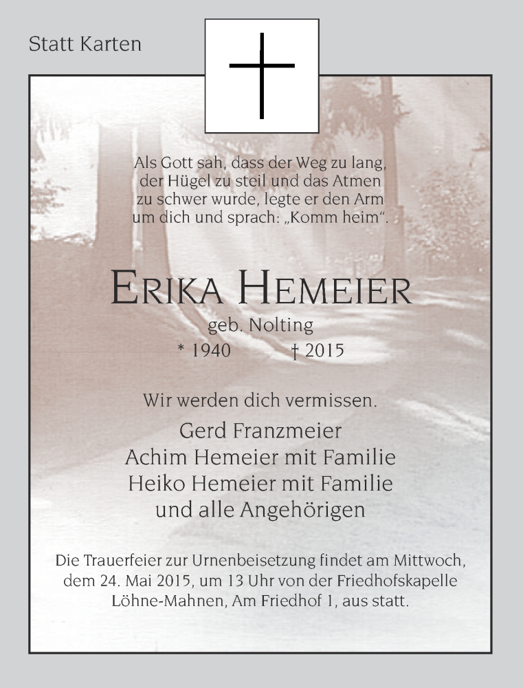 Hier finden Sie alle Traueranzeigen aus der Zeitung, die bisher für Erika Hemeier erschienen sind. Weitere Traueranzeigen, die in der Zeitung erscheinen, werden hier ebenfalls aufgelistet