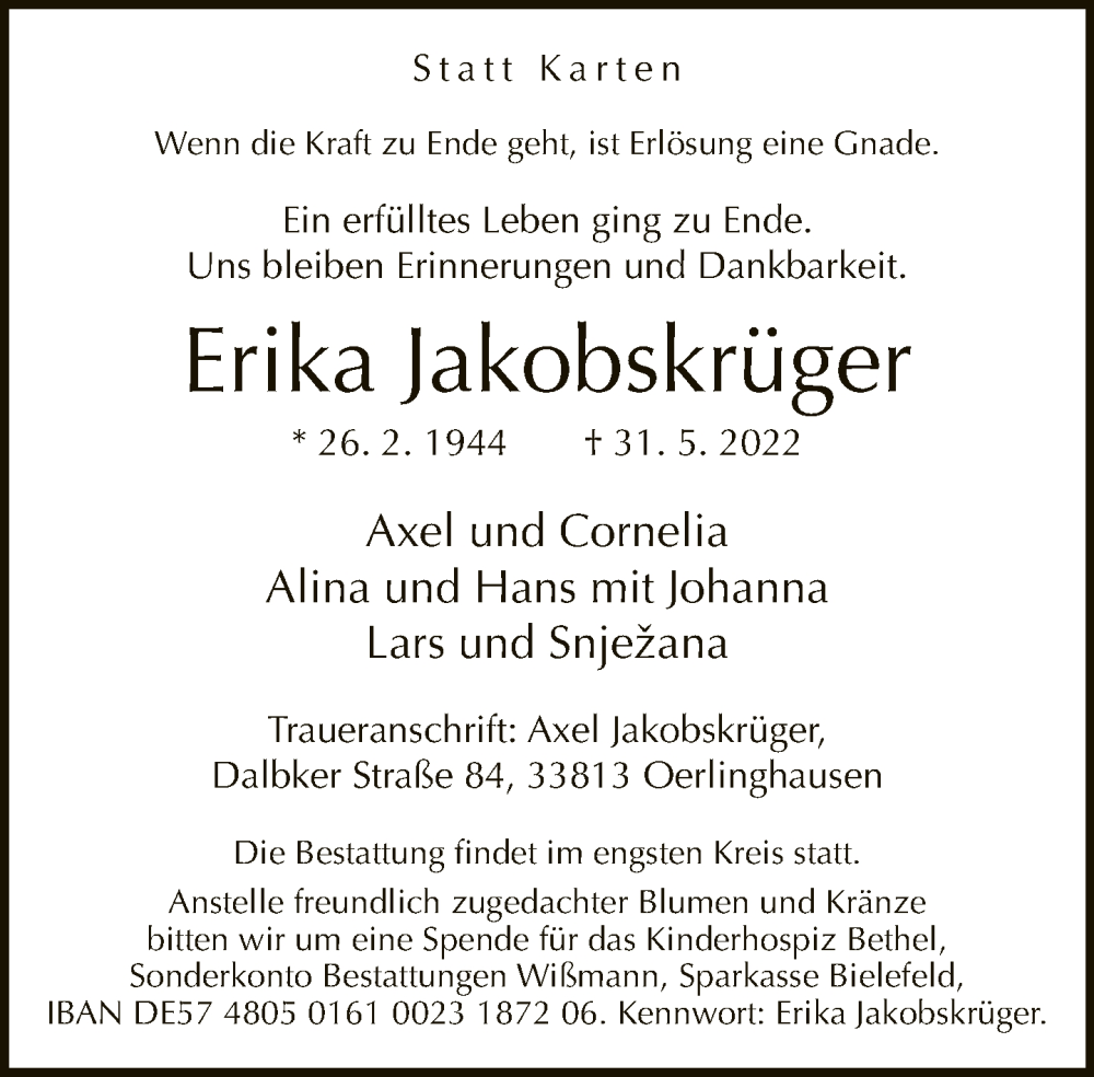 Hier finden Sie alle Traueranzeigen aus der Zeitung, die bisher für Erika Jakobskrüger erschienen sind. Weitere Traueranzeigen, die in der Zeitung erscheinen, werden hier ebenfalls aufgelistet