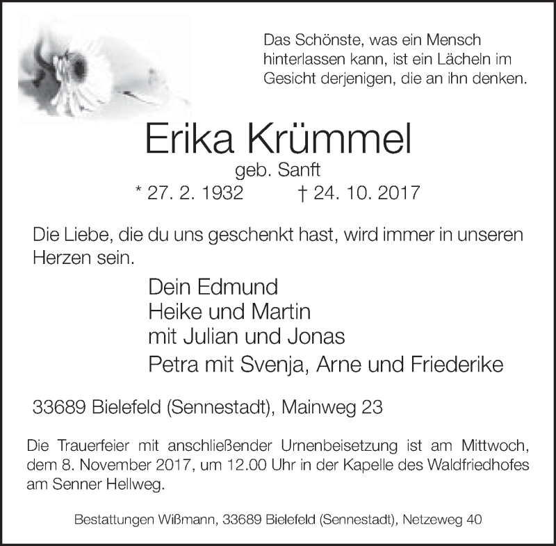 Hier finden Sie alle Traueranzeigen aus der Zeitung, die bisher für Erika Krümmel erschienen sind. Weitere Traueranzeigen, die in der Zeitung erscheinen, werden hier ebenfalls aufgelistet