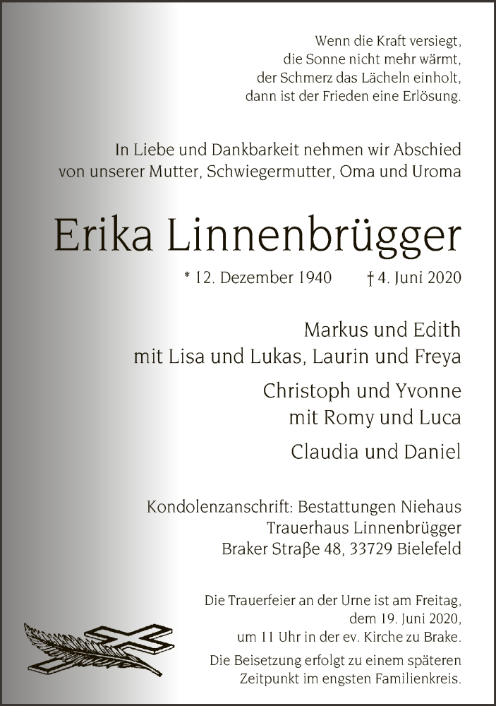 Hier finden Sie alle Traueranzeigen aus der Zeitung, die bisher für Erika Linnenbrügger erschienen sind. Weitere Traueranzeigen, die in der Zeitung erscheinen, werden hier ebenfalls aufgelistet