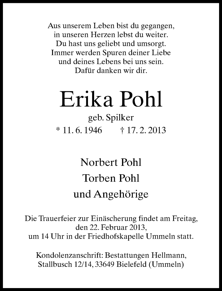 Hier finden Sie alle Traueranzeigen aus der Zeitung, die bisher für Erika Pohl erschienen sind. Weitere Traueranzeigen, die in der Zeitung erscheinen, werden hier ebenfalls aufgelistet