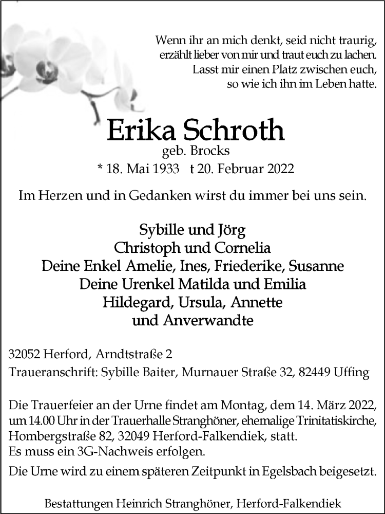 Hier finden Sie alle Traueranzeigen aus der Zeitung, die bisher für Erika Schroth erschienen sind. Weitere Traueranzeigen, die in der Zeitung erscheinen, werden hier ebenfalls aufgelistet