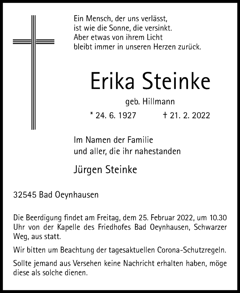 Hier finden Sie alle Traueranzeigen aus der Zeitung, die bisher für Erika Steinke erschienen sind. Weitere Traueranzeigen, die in der Zeitung erscheinen, werden hier ebenfalls aufgelistet